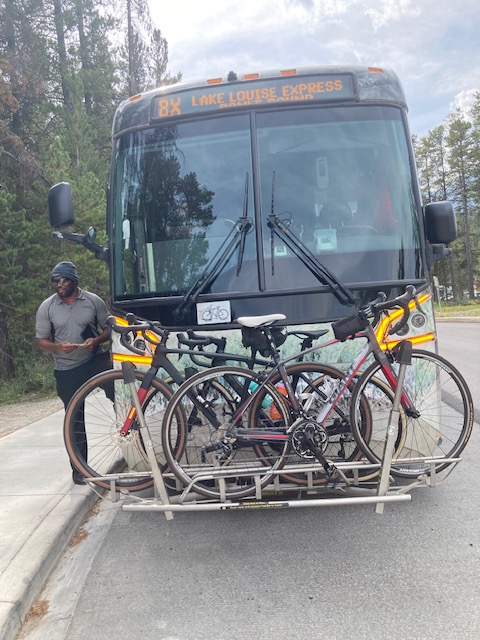 On the way back we rode down to the Lake Louise townsite to catch the ROAM bus back to Banff to avoid heat stroke. Some of these buses have bike carriers on the front and/or bike racks inside the bus. Please be aware that if you have an e-bike that you will have to remove the battery from the bike before you are allowed to . We were able to jump on the bus (fare is $10.00) at the bus stop to the West of Samson Mall. During the summer it is recommended to book your seat in advance.