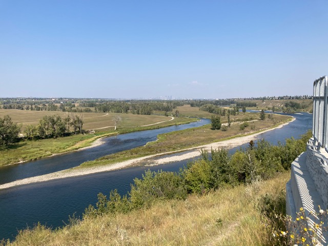 First we loaded up the truck with both the canoes (you could substitute SUPs, kayaks or rafts) and the bikes. We then dropped off the canoes at the Graves Bridge launch site and tethered them to a concrete pilon. Next, we went down to the Fish Creek boat launch site at the end of Bow Bottom Tr. S.W. and got suited up to bike upstream to the canoes. We chose to go on the Bow River bike path on the opposite side of the river up on the escarpment by the communities of Mountain Park and Douglasdale. There, we could get excellent views of the Bow River, city, and Rocky Mountains. Once we arrived back at Graves Bridge we released the canoes and locked up our bikes. We then launched the canoes and had a relaxing paddle down to Fish Creek. Along the way we saw a variety of birdlife including Cormorants and Merganser Ducks. Finally, after docking the canoes at Fish Creek, we loaded them back in the truck and retrieved our bikes from the Graves Bridge site (total time was about 3.5 hours). What a great way to spend a hot day!