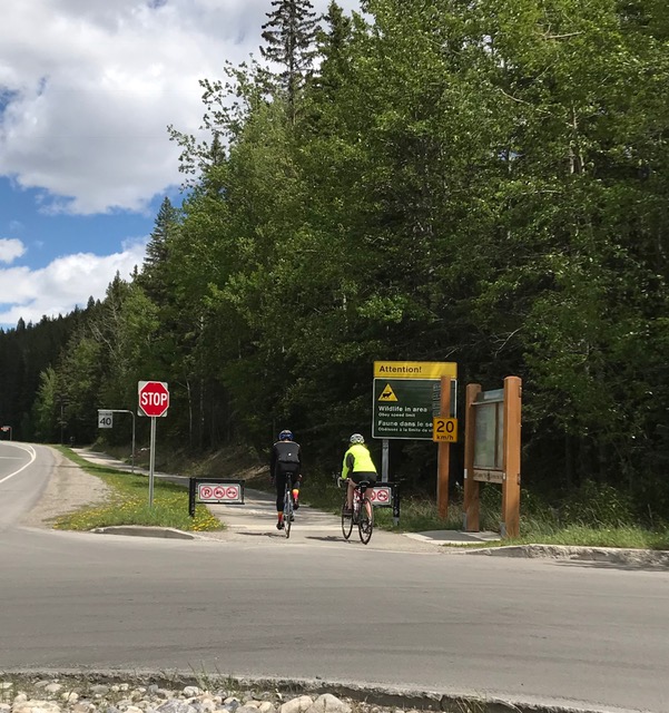 The pathway is well design with gentle grades and curves. Two hazards to watch for are the occasional access gates that keep motor vehicles off the pathway and electric mats to keep wildlife off the highway. Keep an eye out for approaching cyclists when going through these gates as the pathway narrows. Of concern is the one and only curve which is well marked and located at the 5.7 km mark on the out trip. This curve is really only dangerous on the return trip when you have the wind at your back and it is tempting to pick up speed. This chicane is well marked with SLOW painted on the asphalt, signs and fences. Every year Parks Canada seems to add more warning signs. We have seen many experienced cyclist leave the pathway here and crash into the gravel escarpment. If you don’t believe me, ask any Banff or Canmore based paramedic how many call outs there are to this location. Make a mental note of this chicane on your out trip…and do slow down on your return.